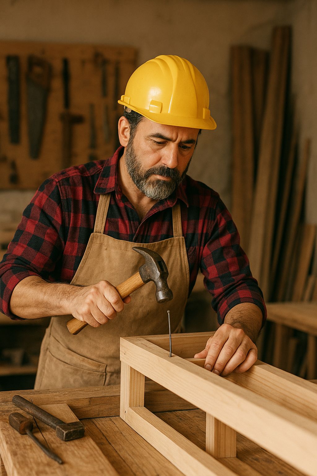 Construye estructuras de madera, encofrados para hormigón, techumbres y terminaciones. Puede especializarse en carpintería de obra gruesa o carpintería de terminaciones (puertas, muebles, marcos, etc.)